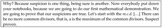 In connections CC11, CC25 and CC32 there were connections between different numerical sets: natural, integers and decimals; and in connection CC2 there was a connection between the concepts of greatest common divisor and least common multiple. In the same way as in the previous cases, it can be interpreted that these were inter-conceptual connections and that the knowledge mobilised by the teacher in these cases was of KSM type. However, in these last four cases it was also observed that the teacher’s interventions were focused on a procedimental treatment of the contents, which is why it was decided to classify the knowledge mobilised by the teacher as KoT. Moreover, the classification of ambiguity between KSM and KoT was in favour of the use of KSM. In the case of the CC1 connection, there is a connection between the least common multiple and the greatest common divisor. In this case, what determined the classification of the knowledge mobilised by the teacher was the depth with which the connection was made (Figure 17), by means of a mathematical demonstration that in the case of a number b being a multiple of a number a, it will always be the case that y que . The demonstration of the two results shows how the two concepts are related, which goes beyond the knowledge of properties and procedures and is related to a deep understanding of the multiplicative structure of integers.