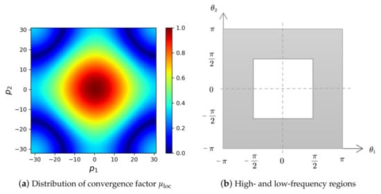 Figure 1a shows the distribution of the convergence factor of weighted Jacobi () in solving a linear system for the Poisson equation. For a better understanding, let , , . Define the high and low-frequency regions