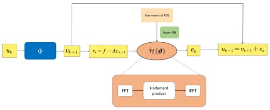 Figure 2 shows a flowchart of the th step for the FNS. The module for solving the residual equation in frequency space is denoted as . It consists of three steps: FFT→Hadamard product→IFFT. The parameter of is the output of the hyper-neural network (HyperNN). The input of the HyperNN are the PDE parameters corresponding to the discrete systems. During training, the only parameter of the HyperNN serves as the optimization parameter.
