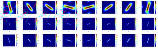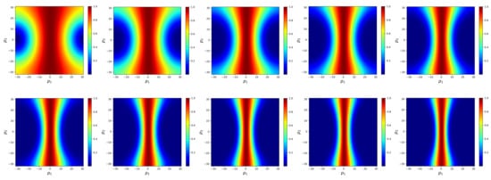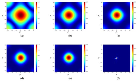 are the roots of an order Chebyshev polynomial. Here, is obtained by the power method [44], but calculating often incurs an expensive computational cost. Therefore, we use to replace . The resulting method is referred to as a Chebyshev semi-iteration. We take . Figure 3 shows the convergence factor obtained by LFA. It can be seen that the smooth effect improves as m increases. However, the high-frequency error along the y direction is also difficult to eliminate. When is the Jacobi method, we implement five-times and transform the residual to frequency space to correct errors. This is because employing the stationary method many times can enhance its smoothing effect.