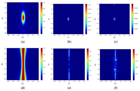 We use and Cheby-semi () as examples to illustrate the error that learned. Figure 4a shows the convergence factor obtained by LFA of Cheby-semi () for solving the system with . It can effectively eliminate the error components except for low-frequency errors. Figure 4b shows the distribution of errors before correction in frequency space. The result is consistent with the guidance of LFA, i.e., the error is concentrated in the low-frequency modes. Figure 4c shows the distribution of errors learned by in the frequency space at this time. Its distribution is largely similar to that of Figure 4b. Figure 4d–f show the corresponding situation for . In this case, Cheby-semi () is unable to eliminate the error along the y direction. However, is still capable of learning.