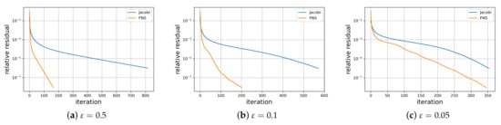 The FNS can take various kinds of . In this case, we use weighted Jacobi, Chebyshev semi-iterative (Cheby-semi) and Krylov methods. The weight of the weighted Jacobi method is . We use a DenseNet [41] to give the basis vector of the Krylov subspace, then approximate the solution in this subspace by least squares as in [20]. For the Chebyshev semi-iterative method, we provide a brief summary here. More details can be obtained in [42,43].