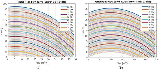Figure 2 shows the pump characteristic head–flow (H–Q) curves (pumping head in meters on the x-axis and flow in m3/h on the y-axis) at different speeds (equivalent to frequency variations from 5 to 50 Hz) for the four identical submersible pumps used for collecting the water from the wells in Figure 2a and for the surface pump used for distributing the water to the irrigation network in Figure 2b.