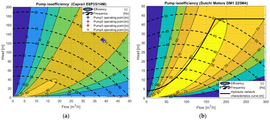 By combining the hydraulic network characteristic curves of each pump, Equation (1), with the head–flow (H–Q) curves, and Equations (10)–(12), with the pumps efficiency variation based on the pumps speed variations (η–Q) from Equation (13), can be combined to obtain the iso-efficiency curves (Figure 4, pumping head in meters on the x-axis, flow in m3/h on the y-axis). The pump efficiencies are represented as percentages by the dotted lines, while the pump frequencies are represented in Hz by the dashed lines. In order to operate the pumps close to their optimal operation, the pumping system control strategy must be developed based on the operating points of the four identical submersible pumps (Figure 4a) and the hydraulic network characteristic curve (Figure 4b).
