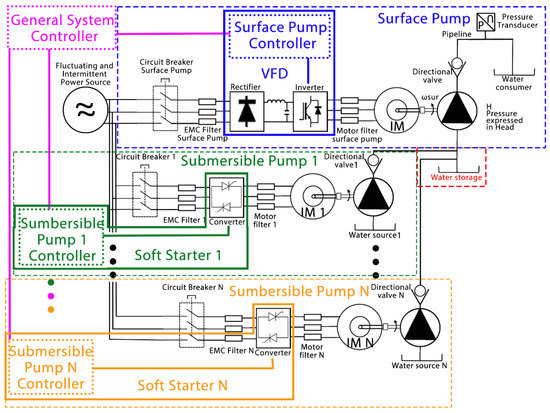 Figure 5 presents the structure of the multi-pump control system formed of two levels. The first level consists of one surface pump controller (Sr.PC) that controls the irrigation pressure by driving the induction motor at various frequencies and the submersible pump controllers (Sm.PC). It can be also seen that the induction motor of the surface pump is driven by a VFD (variable frequency drive), while the induction motors of the submersible pumps are driven by soft starters. Both motor drives contain, in addition to the controllers, the execution elements (rectifier + inverter, respectively converter). Furthermore, the VFD controller is named Sr.PC, while the soft starters controllers are named Sm.PC (from 1 to n). The second level is a general system controller (GSC), which manages the operation of each pump (all pumps) based on the water level in the pool (water storage) and the generator’s available power.