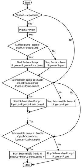 If the water level in the pool (water storage) is not at a minimum level, and the user has programmed the irrigation and has enabled the surface pump to be operable, the GSC verifies whether the available power in the generator is higher than the power necessary for starting the surface pump and gives the order to start the surface pump operation while updating the available power. If any of those conditions are not met, no actions are taken, and the system receives the order to stop the surface pump in a case where it is already running. The next step consists of verifying whether there is still room to pump some water in the pool and, based on the submersible pumps’ availability and priorities (introduced by the user), the pumps start their operation according to the power available in the generator. The generator’s available power refers to the power generated by a photovoltaic generator or electrical wind turbine or the contracted power from the electrical grid according to the electricity consumption schedule or contract of the user, less the power already in use by the operating pumps.
