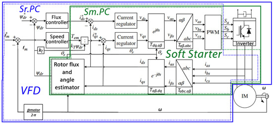 The submersible pump induction motors are controlled by soft starters that control the acceleration at the nominal speed (equivalent frequencies ranging from 0 to 50 Hz) and deceleration from the nominal speed (equivalent frequencies ranging from 50 Hz to 0 Hz) of the induction motors. As can be seen in Figure 7, they are controlled using a classical solution for current regulation in vector-controlled AC drives, called the current regulator, considering a PI-type regulator. This current regulator is tuned using the pole-zero cancellation method based on the second-order equivalent system of the induction motor currents [38].