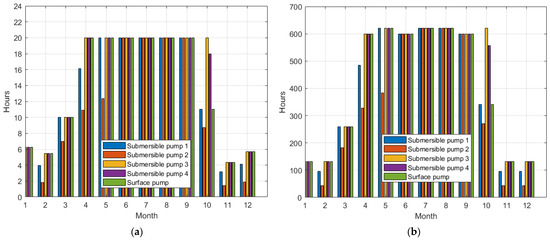 In Appendix A, Table A1, Figure 2a shows that the submersible pumps operating over 38 Hz avoid vacuum operation (when the pump propeller rotates without pumping any water, heating the motor until it short-circuits). Figure 2b shows that the surface pump must operate over 40 Hz to ensure correct irrigation (by providing the necessary pressure for the entire irrigation network).