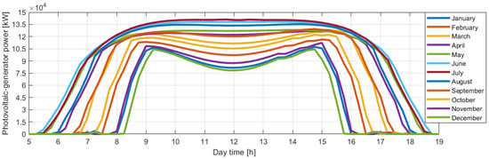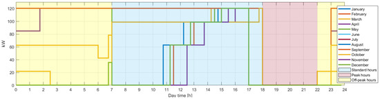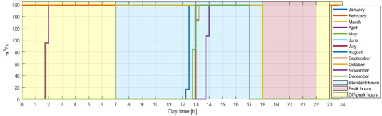The considered system consists of four identical submersible pumps [24] (n = 4 in Figure 1) pumping water from four different wells to the water storage unit (pool), with a capacity of 25,000 m3. The dynamic water level in each well (100 m, 98 m, 100 m and 105 m), together with the extracted flow by each submersible pump (38.52 m3/h, 38.88 m3/h, 31.68 m3/h and 41 m3/h), was measured at the site location with the help of a probe and an ultrasonic flow meter (for full details, please see Table A1 in Appendix A). The water from the pool is distributed to an irrigation network by a surface pump [25] with an average flow of 158.5 m3/h. Currently, the entire system is powered by an electrical grid with three price periods (standard, peak and off-peak) but, in the future, it needs to be hybridized with a photovoltaic generator so as to further reduce the system operating expenses.