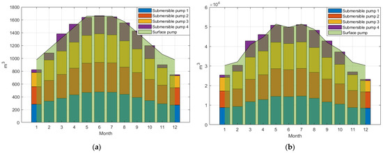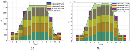 The water storage is modelled as a pool with a capacity of Vpool = 25,000 m3, which balances the water volume extracted from the pool by the surface pump, with the water volume discharged to the pool by the submersible pumps, as in Equation (3):