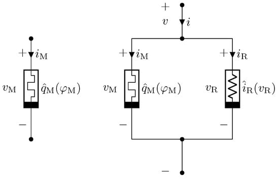 Let (or ) be the voltage (or current) of the memristor (Figure 1). In addition, consider the flux and the charge . An ideal flux-controlled memristor is defined by the constitutive relation , where is the nonlinear flux–charge characteristic. Differentiating in time, we find that an ideal memristor satisfies the state-dependent Ohm’s law: