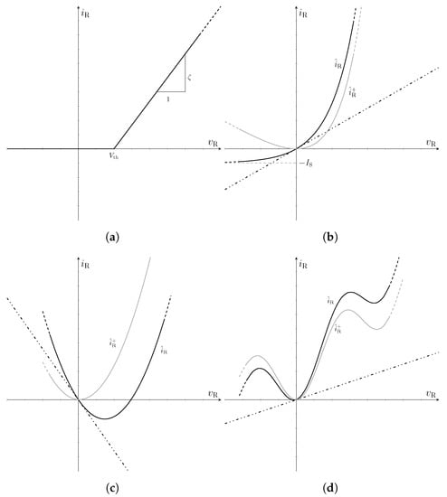 Characteristics of for a nonlinear voltage-controlled resistor. (a) PWL diode satisfying Assumption 1. (b) Exponential characteristic of a Shockley diode satisfying Assumption 2; the drawing also shows the tangent to at (dashed–dotted) and the function (light gray). (c) Characteristic with a negative slope at satisfying Assumption 2 and (d) non-monotone characteristic satisfying Assumption 2.