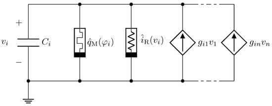 The authors of [32,33,35,36,43] considered an array of n interconnected dynamical cells with a structure of an NN. The circuit schematic of a cell is depicted in Figure 3. The i-th cell is obtained via the parallel connection of an ideal capacitor and an ideal flux-controlled memristor , that is, the cell is obtained by replacing the linear resistor in a typical cellular neural network (CNN) cell with a memristor (compare Figure 3 with ([23], Figure 3)). This array is called an ideal memristor neural network (IMNN). It is observed that in the cell of Figure 3, the only nonlinearity is the memristor, while in a CNN, the nonlinearity corresponds to the piecewise-linear input-voltage/output-voltage characteristic implemented by an operational amplifier. The interconnection of the j-th cell, , with the i-th cell is obtained by means of a linear conductance . Actually, is sensed via an operational amplifier operating as a buffer, and a voltage-controlled current source (VCCS) is used to inject the current into the i-th cell. A possible circuit implementation of the buffer and VCCS is discussed in the appendix of [23].