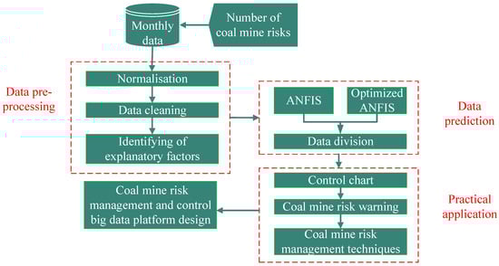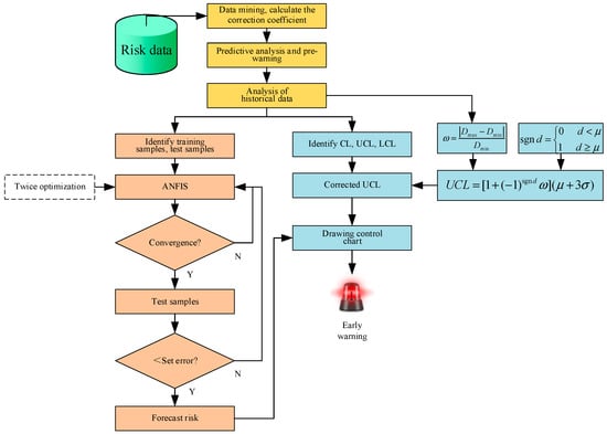 In coal mining enterprises, risk early warning is the key to advance the risk control gateway. The safety early warning model of coal face was established based on FCM (fuzzy clustering model) and GA-BP (genetic algorithm–back propagation neural network) [41]. The early warning model of coal and gas outbursts and human factor risk was established based on data mining [42,43]. The prediction model was constructed to improve the safety and productivity of underground coal mines, using a hybrid CNN–LSTM (convolutional neural network–long-short-term memory neural network) model and sensors supported by the Internet of things [44]. Most studies have studied the risk of coal mine accidents from the perspective of evaluation and management. However, in an actual working coal mine, risk is identified and warned of in advance, and then it is dynamically grading controlled. This can prevent trouble before it happens. Therefore, this paper mines data from coal mine risk information. Based on this, ANFIS (adaptive network-based fuzzy inference system) is optimized to predict the risk of coal mine accidents. The optimized control chart is used for risk early warning to build a coal mine risk management and control system.