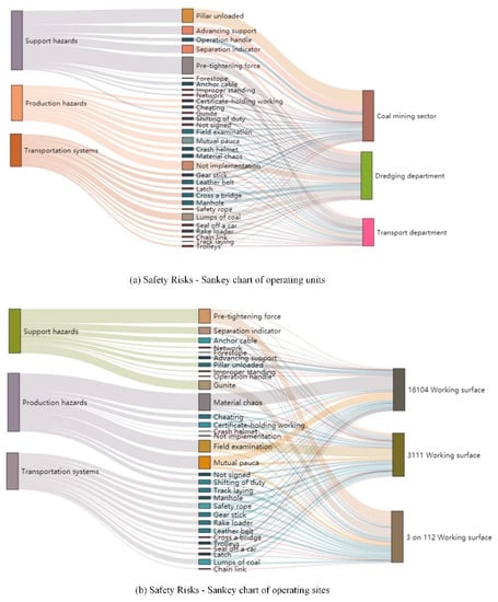 Because displaying a large amount of data at the same time may affect the data visualization effect, more representative hidden danger types, operation units, and hidden danger locations were selected to draw the Sankey chart. Taking the hidden danger of coal dust and support as an example, the safety hazard characteristics of different work units and different hidden danger positions were obtained. The Sankey chart of safety hidden danger is shown in Figure 5.