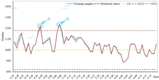Three-violations refer to three types of violations made by coal mine workers, i.e., illegal command, illegal operation, and violation of labor discipline. The training samples and predicted values were the changing trends of the number of three-violations, as shown in Figure 11. The more three-violations, the higher the coal mine’s risk. From Figure 11, although three-violations exist, the number was within the UCL, indicating that the risk level of the coal mines in this period was within an acceptable range. In recent years, coal mine safety management achieved good results with no major risks or accidents, thus the coal mine safety is under control. In this paper, the statistical range of data was expanded to further explain the runaway phenomenon of control charts.