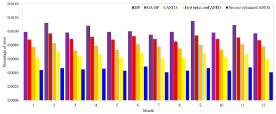 The changing trend of the risk prediction data was the same as that of actual data, indicating that the secondary optimization of ANFIS did not affect the changing trend of the coal mine risk prediction. From Figure 10, the error was within 4, which was 66% lower than the original error and 60% lower than the first optimization. The analysis of the results of the two optimizations shows that the optimized ANFIS has good function approximation characteristics, fast convergence speed, and high precision, and can automatically form fuzzy reasoning rules and adjust learning parameters.