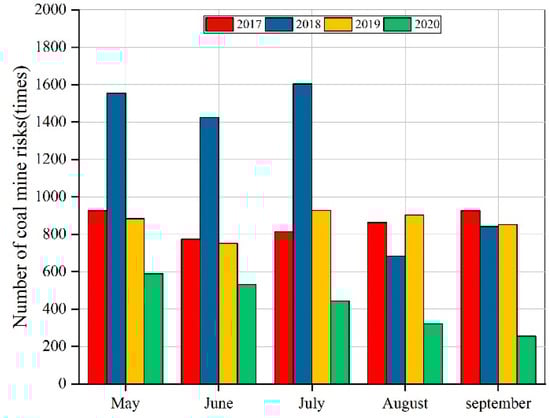 Luxi Coal Mine, located in Yanzhou City, is a new modern mine approved by the State Planning Commission of China. It was completed and put into operation in May 2004. The mine area is 59.6 km2, the geological reserves of the mine are 324 million tons, the industrial reserves are 108 million tons, and the production capacity is 1.5 million tons/year. The data for this study came from the Luxi Coal Mine, which had generated a large amount of mine safety risk data since the implementation of the mine safety risk management system in 2014, and this paper selected a total of 92,937 risk data generated from May 2017 to June 2021 as data support. It is worth noting that risk data are mainly related to workers’ violations, as shown in Figure 4. This paper predicts behavioral risk from a macro perspective. Based on the rule that the number of violations changes with time, the number of violations of work areas or coal mining enterprises in a certain period of time in the future was analyzed and predicted.