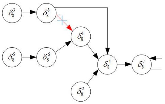 For case (iv), we modify K to make system (20) stabilizable to after the function perturbation. Since the eighth column of is changed from to , we derive a cycle . Then one can find a control such that