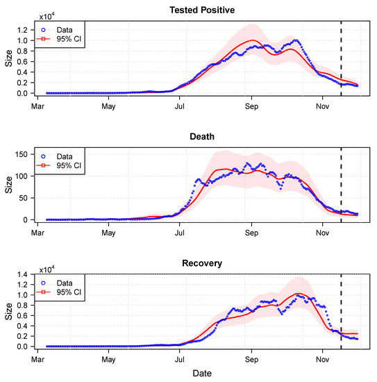 The data we used in this retrospective study represent daily positive cases, daily recovered cases, daily death cases, and the daily number of tests, ranging from mid-March to early December 2020, which was publicly available in [24]. We partitioned the dataset into a training set for model calibration and a validation set for prediction. The validation set consists of the last fourteen days for each state in the above timeline. The reason for selecting a short duration of two weeks for prediction is due to the fact that accurate long-term prediction is difficult for such a complex transmission dynamic. We used a centered moving average with a seven-day window to smooth the data as a pre-processing step. Google’s COVID-19 Community Mobility Reports, a database built on GPS data collected from mobile devices with the “Location History” option turned on, provides a proxy for the reduction in the mobility of people. Since the testing data were not available before 15 April 2020, we extrapolated one month of testing data using an exponential function fitted to the available testing data. We also used spline interpolation to impute some in-between missing testing data.