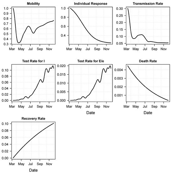 with initial values and (baseline state). For modeling of , we assume that the number of contacts among people decreases in proportion to overall mobility during shutdown. is then modeled by fitting smoothing splines to the average mobility change reported by the Google COVID-19 Community Mobility Report from tracking activities of mobile phones in each state [9,10,23]. For , we model it as a time-dependent sigmoid function with parameters to be calibrated from the data. is able to model the drop of cases even after the lifting of lockdown, which indicates people are more aware of personal protective measures to prevent infections, i.e., strictly follow rules of social distancing, wearing masks, personal hygiene, and self-quarantine. The public behavior function is modeled by the following sigmoid function: