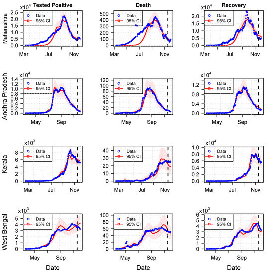 The spread of the virus in India was heterogeneous across states, which could be attributed to the different degrees of implementation of the central lockdown policy and citizens’ response for each state. Therefore, we selected five representative Indian states, namely, Maharashtra, Karnataka, Kerala, West Bengal, and Andhra Pradesh for the retrospective analysis. The proposed models are calibrated to daily COVID-19 data on daily infection, recovery, and death cases from mid-March to early December 2020 for these states. We partition the dataset into the training set to calibrate the model, and the validation set for prediction from the calibrated model. We also used mobility data for estimating the transmission rate and the testing data to estimate the rate of transition from the asymptomatic and symptomatic stages to the reported and quarantined stage. One of the goals of this retrospective study is to compare the various parameters of the fitted model across these states and analyze if the state-wise intervention policies have an effect on them. We also estimate and analyze the unknown undetected-to-detected cases ratio, which had a high impact on the COVID-19 pandemic duration and size. The percentage of symptomatic and asymptomatic cases is also estimated and analyzed together with their uncertainties. Assuming that isolation is successfully applied to the positive detected cases, undetected and asymptomatic cases would represent the primary source of infections. The estimated number of undetected and asymptomatic cases and their uncertainties could be critical for the public health decision-makers and individuals [22]. The other goal of the retrospective analysis is to study the effect of different intervention strategies on disease transmission dynamics using the calibrated model. In particular, we compared the possible effect of a few phase-wise less severe shutdown policies instead of a sudden complete shutdown, increased public awareness and personal protective measures such as mask-wearing, personal hygiene, and self-quarantine, and better testing and tracking policies, which can possibly balance the stress of migration workers and control the spread of the virus.