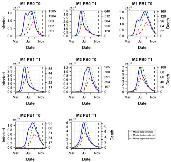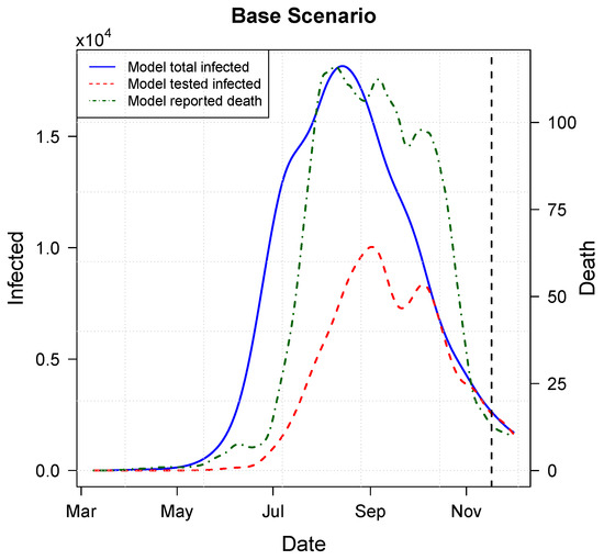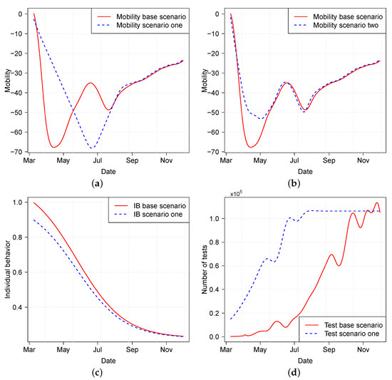 The two proposed lockdown strategies are both less strict than the complete shutdown policy implemented by the government. The idea of the first one is to make the initial lockdown process a gradual one, very similar to the reverse of how the lockdown was lifted gradually during May and June 2020. We fit a linear regression for the mobility data from 20 April to 15 June 2020, and the negative of the fitted slope is used to construct the possible mobility function from 10 March to 20 April 2021. The second initial lockdown scenario is about implementing a sudden lockdown but with fewer restrictions, which would translate to a higher minimum mobility level than the value from the observed mobility data. The blue dash curves in Figure 6a,b show the mobility function for lock-down scenarios one and two respectively. For the individual behavior factor function , we considered a scenario where the initial response is 90% of the base scenario, which represents the public awareness based on the concurrent situations in other countries. The blue dash curve in Figure 6c shows the possible individual behavior function. An exponential acceleration of the reported positive cases started from the time around 1 July 2021, which might be due to the increase in testing during the same period. From Figure 7, our model indicates that the actual outbreak may have already started around 1 May 2021, and the actual infected cases are much higher than the reported data before 1 July 2021. Our hypothetical testing scenario shifts the testing trend that is observed from 1 July to the beginning of the pandemic and then maintains a constant test level from August. Figure 6d plot the hypothetical daily tests, which represent a better intervention strategy in terms of testing and tracking.