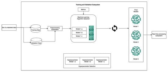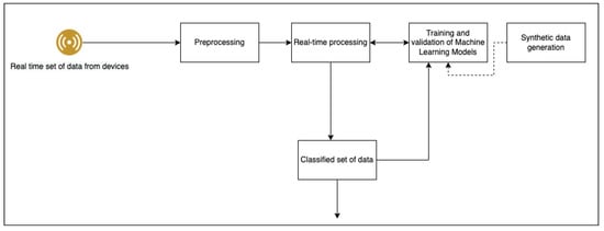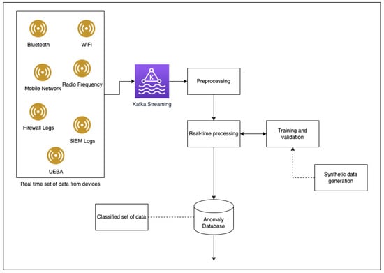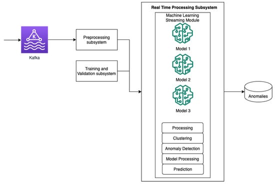 Machine learning algorithms have been previously trained and validated in the corresponding subsystem to detect possible anomalies in the input data. In the real-time processing subsystem, there are several machine learning models for each type of device. The output data correspond to the result of the detection of normal or anomalous events. The trace with the values of the event itself and the result of the detection is stored in the “Anomalies” database with a unique identifier corresponding to the event.
