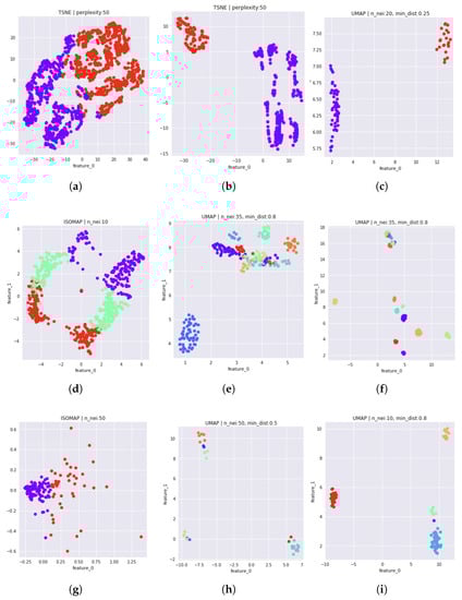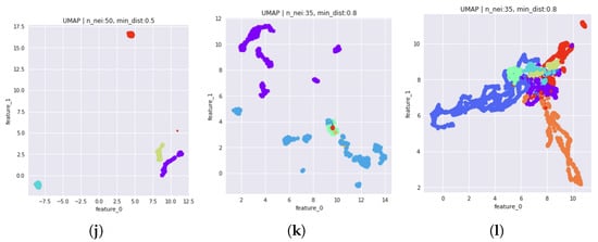Uniform Manifold Approximation and Projection (UMAP) is another dimensional reducer [], and its main idea is to generate a graph from the data belonging to a high-dimensional space and to assign it to another graph that is, however, of low dimensionality.