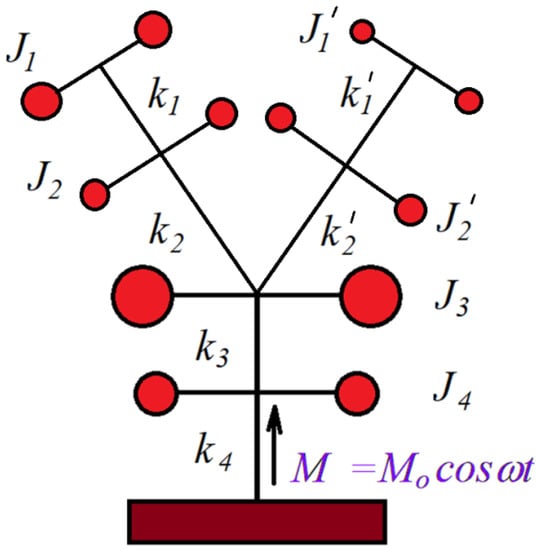For simplicity, let’s consider a vibrating system, without damping, with degrees of freedom. It is also assume that the system is subject to a harmonic excitation with pulsation . The equations of motion for this system are given by the system of differential equations [28,29,30,31]:
