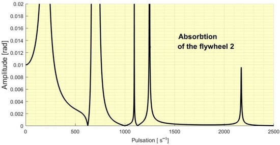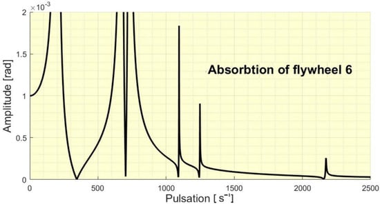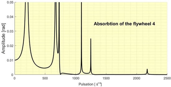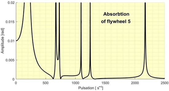 The five values obtained for the considered data represent frequencies for which, upon excitation with a harmonic moment with an amplitude of 100 Nm acting on flywheel 6, a total vibration absorption is obtained at this flywheel (in the case of zero damping). If there is damping, the absorption is very high around these determined values. So we note that for a complex system, there are several eigenpulsations at which vibration absorption can be done. If the system has many components, then the number of excitation frequencies that can be absorbed increase. In Figure 3 it can be seen the amplitude of the forced vibrations at different excitation frequencies.