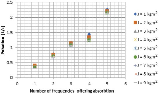 Figure 10 shows the interval of pulsations that ensure the rest of the flywheel six. For each value of the moment of inertia for flywheel two, five pulsations are obtained for which the total vibration absorption of this flywheel takes place.