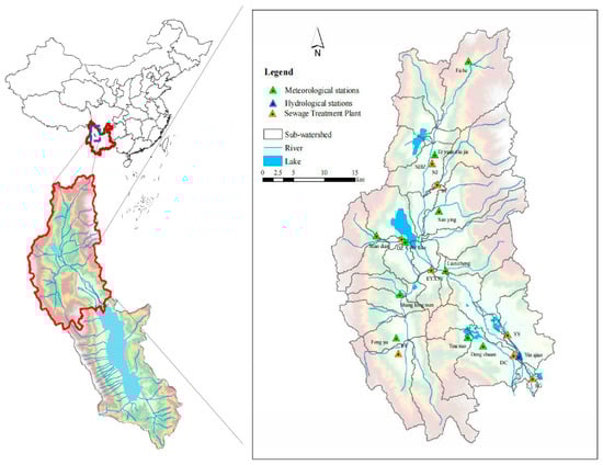 NELB is located to the north of Erhai Lake Basin (ELB), Yunnan province, southwest China (Figure 1). The watershed area is 1222 km2, occupying 47.6% of ELB. The watershed has a plateau monsoon climate, with a mean annual temperature of 14.2 °C and annual rainfall of 744.9 mm [29]. The rainfall is distributed unevenly during the year, with more than 85% of rainfall occurring in summer and autumn, which favors the occurrence of non-point source pollution [8].