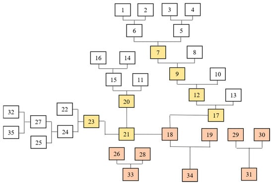 The topological relationship among the 35 sub-basins. The white boxes are upstream in the river water system, whereas those in yellow are in the middle parts, and those in red are downstream.