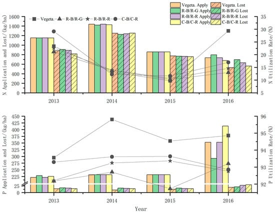 The average annual N balance was 276.83, 190.50, 91.11, and 132.35 kg/ha in Vegeta., R-B/R-G, R-B/R-R, and C-B/C-R, respectively. The N utilization rate in these four cropping systems was 24%, 13%, 11%, and 18%, respectively, with a declining trend until 2015, and then an increase in 2016.