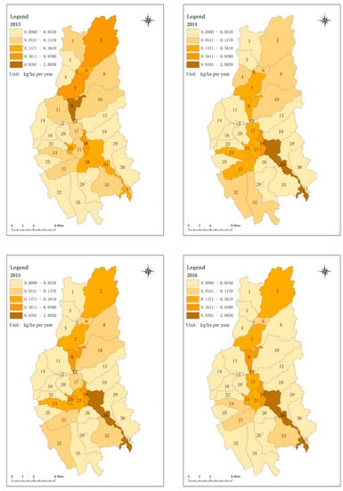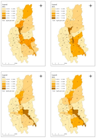 The average annual sub-basin P export intensities to the watershed outlet were 0.231, 0.141, 0.146, and 0.124 kg/ha per year from 2013 to 2016, with a declining trend (Figure 6). The sub-basin with maximum P export intensity was no. 34, with values of 2.892, 1.674, 1.439, and 1.197 kg/ha per year from 2013 to 2016. The sub-basin with the second largest P export intensity was no. 18 (0.939, 0.634, 0.644, and 0.658 kg/ha per year from 2013 to 2016). The intensive P export areas were in the southwest, northeast, and downstream of the river basin, and the area reduced in size over the years.