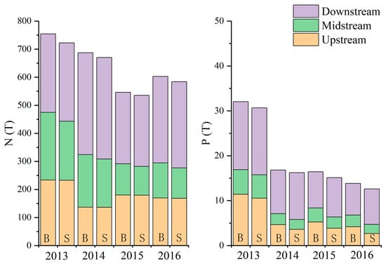 The comparison of N and P loads under different cropping systems was analyzed using SWAT, and the results are shown in Figure 7. Under the BAU scenario, the N loads were 754.25, 687.16, 546.22, and 602.81 t from 2013 to 2016, and the P loads were 32.05, 16.81, 16.43, and 13.81 t in the same four consecutive years. After changing the cropping system, the N loads were 722.23, 670.24, 535.66, and 584.14 t, and the P loads were 30.68, 16.22, 15.12, and 12.61 t in the four consecutive years. Compared with the BAU scenario, the N load in S decreased by 4.25%, 2.46%, 1.93%, and 3.10%, and the P load in S decreased by 4.70%, 3.49%, 9.51%, and 8.81% in the four consecutive years.