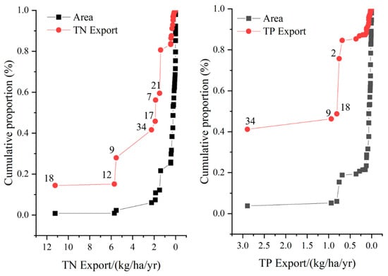 Compared to BAU, the change of N and P loads at the outlet in NELB varied between 4 and 9% in the S1 scenario. The effects of changing the cropping system on the N and P loads into the lake were insignificant in the NELB. According to a previous study, livestock and poultry breeding were major sources of pollution, but planting was not a major pollution source in the NELB region [32,39]. The simulation indicated that the critical source areas were not critical load contribution areas [16]. The fields with the highest N and P loss rates, R-B/R-R and vegetable fields, were mainly located in the Fengyu River Basin and along the mainstream (Figure S1). Meanwhile, there was a greater N and P export from the sub-basins that were closer to the watershed outlet [37]. It is shown in Figure 8 that seven sub-basins, which occupied only about 20% of the total watershed area, contributed approximately 60% of the total N loads. The export of P loads appeared more centralized, with sub-basins no. 34 and no. 2, contributing approximately 70% of the total P export. Moreover, these sub-basins were located midstream and downstream of the basin. These results indicated that the Fengyu River watershed (the sub-basin upstream of the No 23 sub-basin) was not the major contributor to the nutrient load of NELB., although it is the major NPSP generation and discharge area.