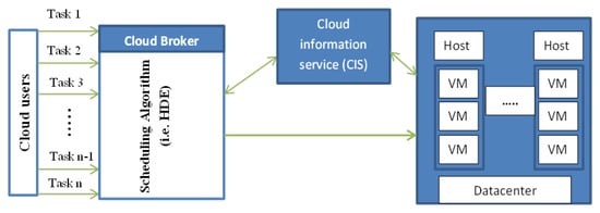 Cloud computing is made up of a large number of datacenters that house numerous physical machines (host). Each host runs several virtual machines (VMs) that are in charge of executing user tasks with varying quality of services (QoS). Figure 1 depicts the task scheduling in a cloud computing environment []. Supposing that there are n cloudlets (Tasks), , which are executed using m virtual machines (VMs), . These tasks have various lengths and the VMs are heterogonous in terms of bandwidth, RAM, and CPU time. The cloud broker makes a request to the cloud information service, to obtain details about the services needed to carry out the tasks it has been given, and then schedules the tasks on the services that have been found. The numerous variables and QoS criteria of the broker influence the choice of the tasks to be provided. The cloud broker is the key element of the task scheduling process, it mediates talks between the user and the provider and decides when to schedule tasks for certain resources. However, there are several issues that need to be considered. The tasks that users submit are first added to the top queue in the system and must wait while the resources are employed. As a result, the system’s queue grows longer, which lengthens the waiting period. However, a more effective approach than the first come first served (FCFS) principle should be used to manage this queue. Second, when the service provider manages the tasks, numerous parameters can be taken into account as multiobjective optimization or single objective optimization, such as the makespan, which directly affects resource consumption []. Therefore, a strong task scheduling algorithm should be created and implemented in the cloud broker, to not only meet the QoS requirements imposed by cloud users, but also to achieve good load balancing between the virtual machines, in order to improve resource utilization [].
