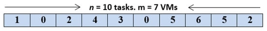 Before starting the optimization process with any metaheuristic algorithm, a number N of solutions with n dimensions (each dimension represents a task in the scheduling problem) for each solution are defined and randomly initialized between 0 and m, to assign each task to a virtual machine. For example, Figure 2 presents a simple example, to illustrate how to represent a solution for the task scheduling problem. In this figure, we create a solution with 10 tasks, where n is 10, and randomly assign a VM to each task in this solution, where the number of available VMs is up to 7. From this figure, it is obvious that the virtual machine with an index of 2 will execute tasks 2 and 9, and the VM with an index of 0 will be assigned to execute tasks 1 and 5, while the other tasks, in order, will be assigned to the VMs: 1, 4, 3, 5, 6, and 5, respectively. In brief, the mathematical formula of the initialization step is defined as follows: