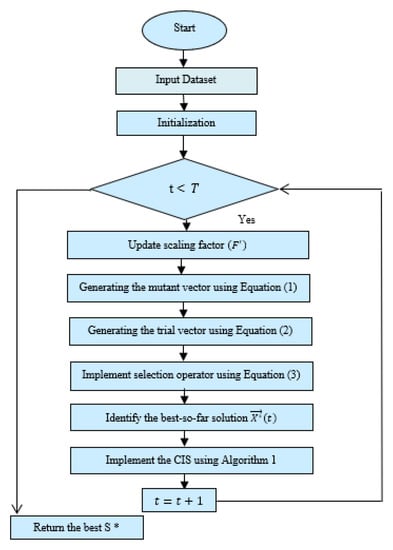 | 1. Initializes  solutions, , using Equation (7)  2. Evaluate the initialized solutions and identified 3. 4. while (t < ) 5. Update using Equation (8) 6. 7. for to 8. Generate the mutant vector using Equation (1) 9. 10. for j = 0 to n 11. a number generated randomly between 0 and 1 12. ) 13. 14. else 15. 16. End if 17. end for 18. 19. = 20. end 21. Replace the best-so-far solution with if is better 22. end for 23. Updating solutions using the CIS algorithm (Algorithm 1) 24. 25. end while Return  |