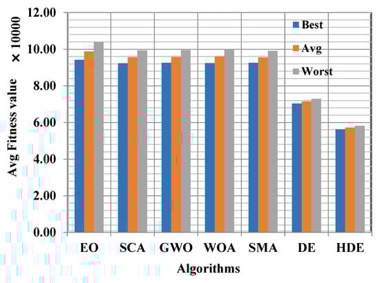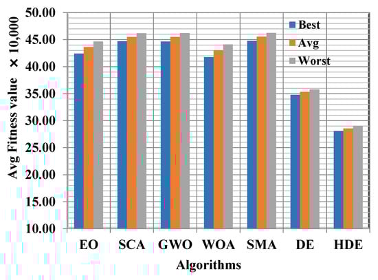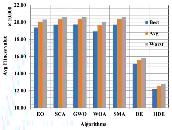 Due to the fact that meta-heuristic algorithms are stochastic optimization techniques, they require at least 10 separate runs to produce statistically significant results. In this study, each algorithm was run roughly thirty times independently, and the average results of each algorithm are reported. In Table A1 are shown the metrics of the best fitness values for each algorithm in the last iteration over all independent runs. These metrics include the mean, best, and worst values, as well as the standard deviation (SD). The top results in this table are highlighted in bold. This table demonstrates that HDE is comparable to DE and superior to all other algorithms for the 100-task size. With growing task sizes, HDE’s superiority becomes more apparent, and it may be the best option for any tasks with lengths more than 100. Additionally, to further show the efficiency of HDE, the average of the best, worst, and mean fitness values obtained for all the tasks sizes were computed and are presented in Figure 4, which affirms that HDE was the best for all shown metrics. Figure 5 shows the average (Avg) standard deviation (SD) obtained by each algorithm on all tasks sizes. Inspecting this figure shows that HDE was more stable than the other algorithms. After discussing the effectiveness of HDE in terms of the fitness value, we will move on to discuss its capacity to reduce the makespan in the next paragraph.