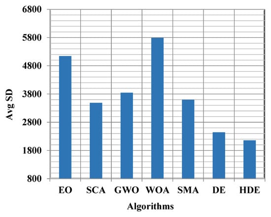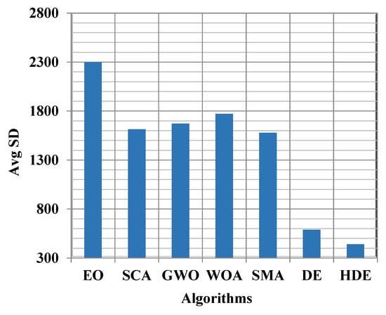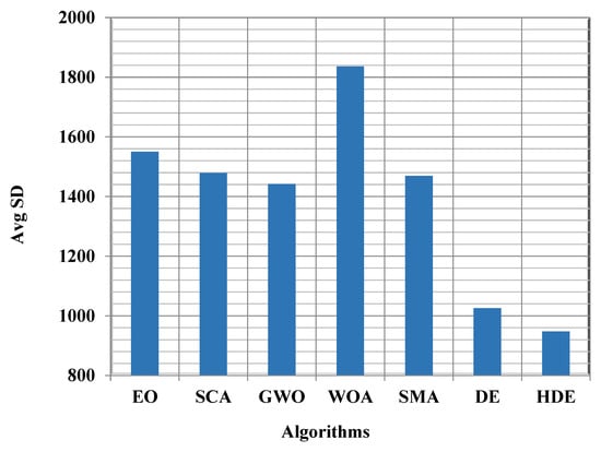 The average, worst, best, and SD values obtained as a result of analyzing the total execution time values obtained by the various investigated metaheuristic algorithms within 30 independent runs are reported in Table A3. Based on the results in this table, it is clear that HDE performed just as well as DE and was superior to all the other algorithms when it comes to a size of 100 tasks. It is probable that HDE is the optimal option for all tasks with lengths that are larger than 100. The superiority of HDE became more readily apparent as the size of the tasks was increased. The average of the mean, best, and worst total execution values that were obtained for each of the various task sizes was computed and are given in Figure 8, in order to showcase the efficacy of HDE in a more thorough manner. This was done in order to prove that HDE was effective. This figure illustrates that HDE was the best strategy for each of the metrics that are presented. Figure 9 depicts the average of the standard deviation (SD) values that were obtained using each method for all of the various task sizes. When taking a closer look at this figure, it can be noticed that HDE was significantly more trustworthy than any of the other algorithms. Finally, from all the previous experiments and discussions, it is concluded that HDE is a strong alternative scheduler to find the near-optimal scheduling of tasks in cloud computing, with the aim of minimizing both the makespan and the total execution time.