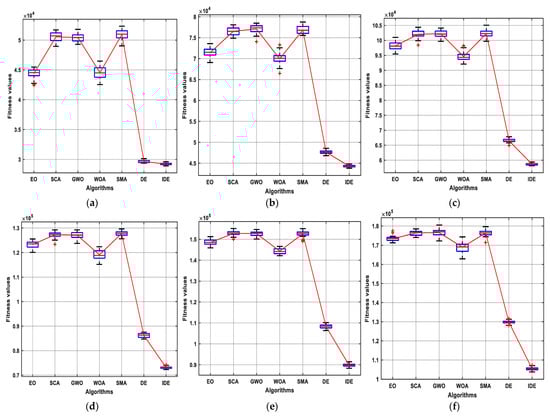 Comparison among algorithms in terms of the Boxplot: (a) Comparison for the task size of 200; (b) Comparison for the task size of 300; (c) Comparison for the task size of 400; (d) Comparison for the task size of 500; (e) Comparison for the task size of 600; (f) Comparison for the task size of 700.