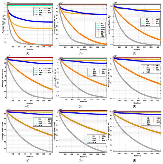 Comparison of algorithms in terms of convergence speed: (a) Comparison for the task size of 100; (b) Comparison for the task size of 200; (c) Comparison for the task size of 300; (d) Comparison for the task size of 400; (e) Comparison for the task size of 500; (f) Comparison for the task size of 600; (g) Comparison for the task size of 700; (h) Comparison for the task size of 800; (i) Comparison for the task size of 900.