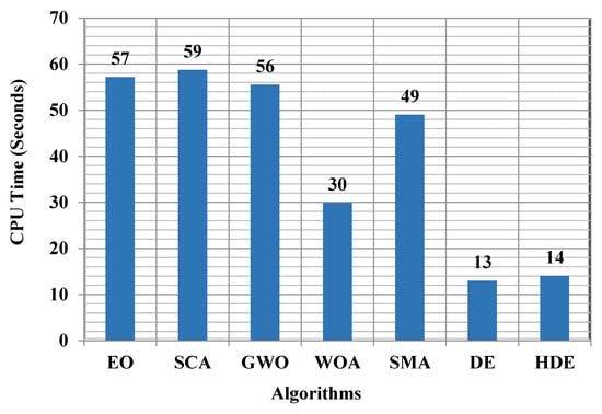 Finally, HDE and the other algorithms were compared based on their respective convergence rates for the fitness function. On the basis of the convergence rates obtained by each algorithm, and presented in Figure 11, for task lengths 100, 200, 300, 400, 500, 600, 700, 800, and 900, HDE achieved superior convergence to the optimal solution for all depicted task lengths. Figure 12 shows a comparison among the algorithms in terms of CPU time. The figure provides the total CPU time in seconds for running each algorithm with different task sizes. HDE had a slightly higher computational cost than traditional DE, but it can provide a better QoS to users, because it can achieve a smaller makepan value for the majority of task sizes.