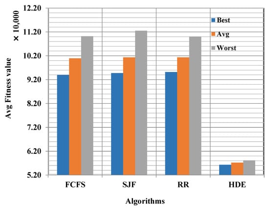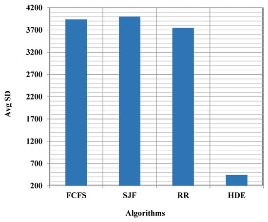 In this section, the proposed algorithm is compared with some well-known heuristic schedulers, such as FCFS, SJF, and round robin, to further verify the superiority of HDE in tackling the task scheduling problem in cloud computing. The results of each method were independently tested around thirty times. In Table A5, the average, worst, and best values are shown, as well as the standard deviations, that were achieved by the proposed approach and by each heuristic algorithm for each task size. The results of this table show that HDE performed significantly better than any of the heuristic algorithms. In addition, in order to demonstrate the effectiveness of HDE in a more comprehensive manner, the average of the best, worst, and mean makespan values obtained for all task sizes were computed and are shown in Figure 13. This figure confirms that HDE was the most effective method for all of the metrics presented. Figure 14 depicts the average (Avg) and standard deviation (SD) of the makespan values obtained by each algorithm across all task sizes. Taking a closer look at this figure reveals that HDE was significantly more reliable than the other algorithms. It is worth mentioning that the heuristic algorithms have a negligible computation cost compared to metaheuristic algorithms, but their solutions are poor when compared to the metaheuristics algorithms. As a result, to provide a better quality of service to the users, while excluding the computational cost, the proposed algorithm is the most effective. On the other hand, if the computational cost is more important than the quality of service, then the heuristic algorithms, specifically FCFS, are the best.