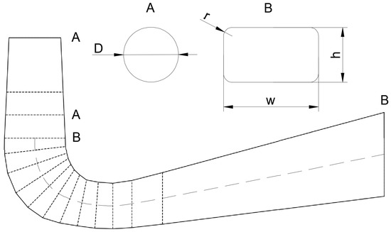 The hydropower plant considered in this work is HPP Rijeka, with an installed capacity of 36.8 MW. It is located on the Rječina River, Rijeka, Croatia, and has an artificially built Valići reservoir V = 6 × 10 m. The Rječina River has torrential behavior, where the average annual flow is 7.48 m/s [22]. Two Francis turbines are located in the underground engine room at a height of 1.6 m above sea level with an installed flow of 2 × 10.5 m/s. The considered turbine has an elbow-type draft tube defined by 16 reference sections. The first three cross-sections have a circular shape that transitions into rounded rectangles (Figure 1). The considered sections are oriented along the curved centerline.