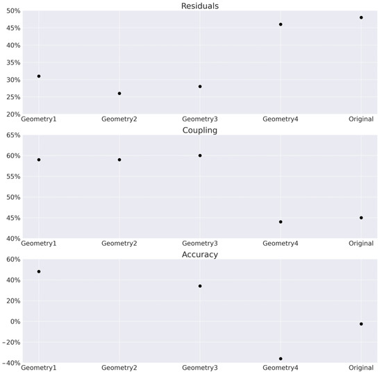 Several additional simulations with new random geometries were conducted for the adopted numerical settings to further explore the chosen parameters’ suitability for the optimization procedure. It was observed that in some instances, the convergence criteria could still not be satisfied. In order to ensure a prompt optimization procedure, it was decided to set a time limit and limit the number of iterations that were to be executed for each simulation. The number of iterations was set to 2000. To pick the appropriate computational time limit, simulations with full geometry were conducted for the initially chosen five geometries. It was observed that for four simulations, the convergence criteria were satisfied within 300 iterations and the simulations ended within 10 min. For one geometry, 1300 iterations were needed, which converged within 15 min. It was decided that it was reasonable to believe that the majority of the geometries would converge within 15 min; therefore, the cutoff limit was set as such. Regardless of this limit, all the simulation results were assessed and if the standard deviation (SD) for the final 20% of the results was sufficiently small, within 5%, the simulation was assumed to be converged. Therefore, even if the residual values as the convergence criteria were not satisfied, if the fitness function value was stable, it was considered a valid optimization candidate. An overview of the used simulation parameters for the optimization procedure is given in Table 7.