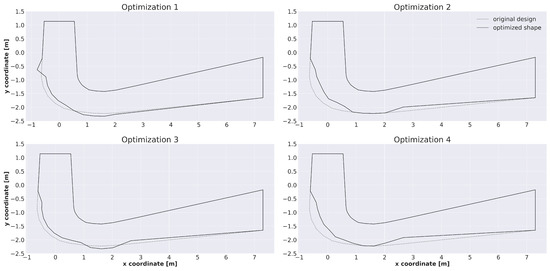 The optimization workflow using a velocity profile at the inlet, i.e., case 2 with full geometry, was conducted with the PSO algorithm, where the swarm size was set to 30 and in total, 500 iterations were conducted. The remaining parameters were kept the same as in Table 7. Four different optimizations were conducted, as described in Table 5. A visual representation of the obtained results is given in Figure 4. An example of the convergence graphs is given in Figure A1 in Appendix A. It can be seen that the shape for case corresponded to a local optimum; hence, the optimization process was allowed to continue to obtain an improved, feasible shape. For cases where the new design must adhere to the limits of the original shape, similar results were obtained, as seen for both cases and . The reduction in the cross-sections can be observed at the beginning, followed by a maximum cross-section at the same location (1–2 m downstream of the center along the x-axis). After that, a reduction in the cross-section width was observed for both cases. The variations in the shape were due to the different goal functions.